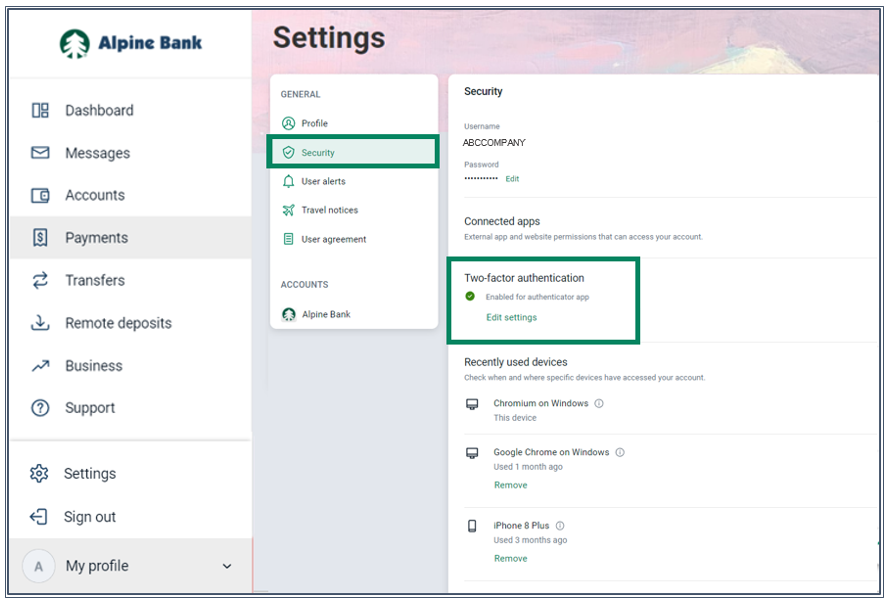 While you are logged in to either your online banking or mobile app, select your name or My Profile from the menu, then click Settings.
